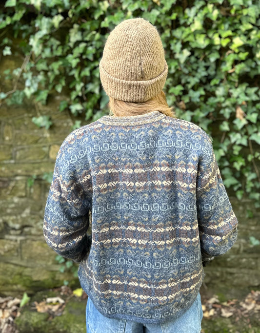Vintage Cambridge 100% Wool Fair-Isle Cardigan in Blue Brown Beige - Size S