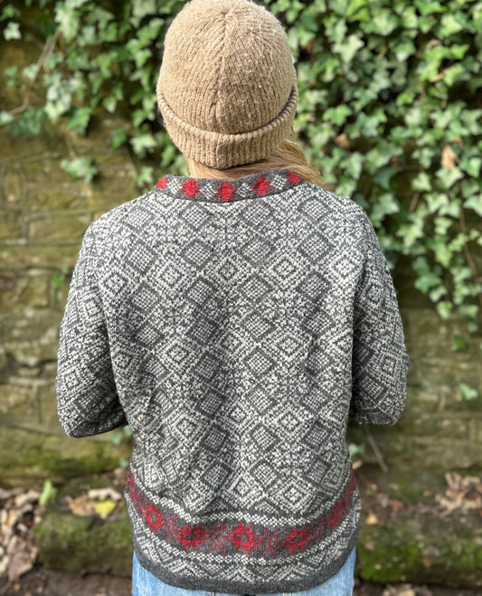 Vintage Skyr Nordic Fair-Isle Cardigan in Grey Red - Size M