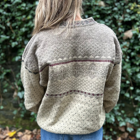 Vintage Nordic Fair-Isle 1/4 Hook Pullover in Brown Beige Bugundy - Size L/XL