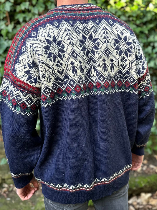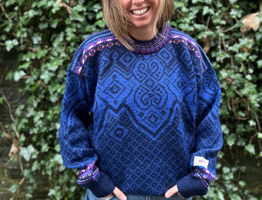 Vintage Dale Of Norway 100% Wool Royal Blue Navy Fair-Isle Sweater - Size L